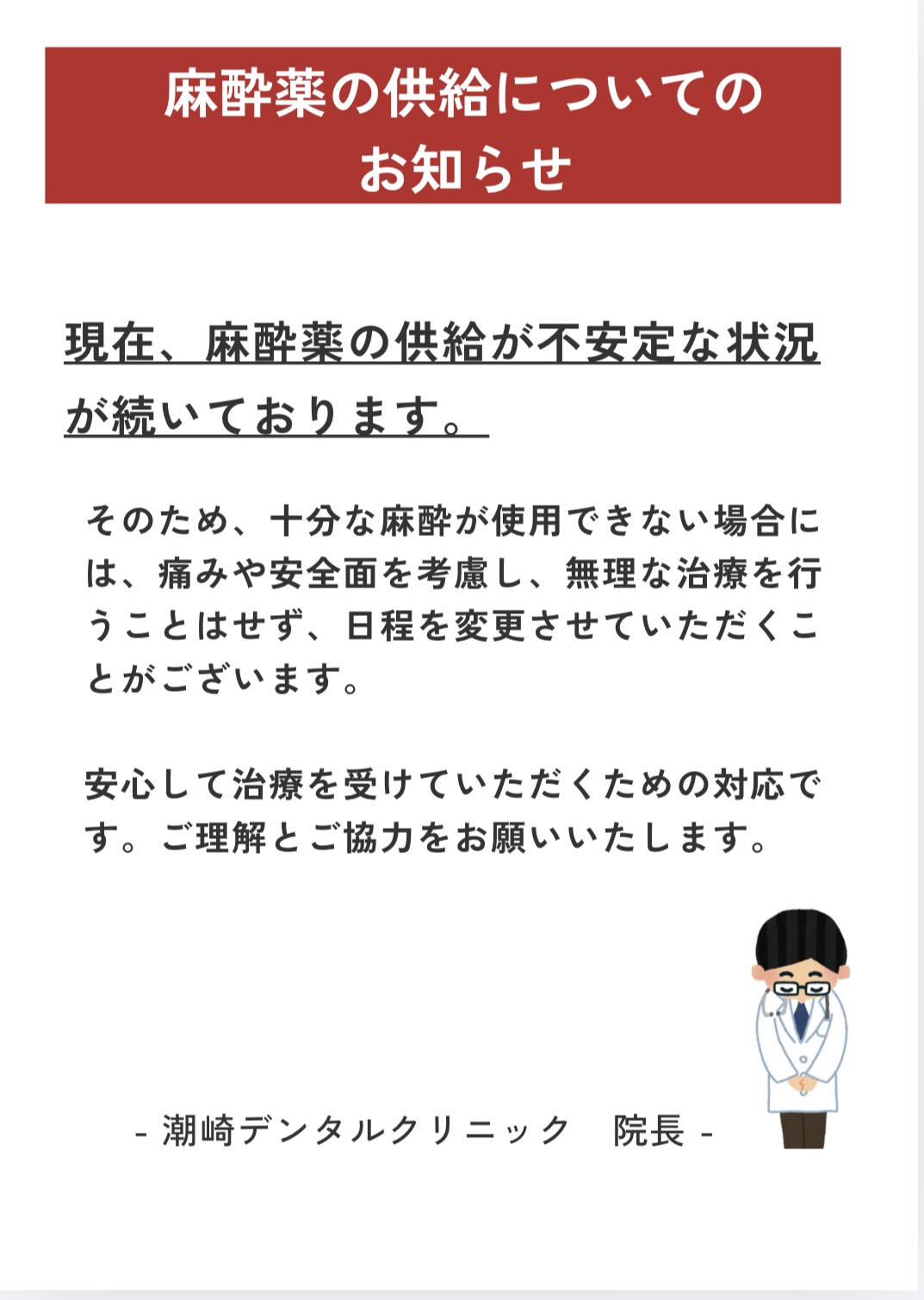 現在、麻酔薬の共有が不安定な状況が続いております。